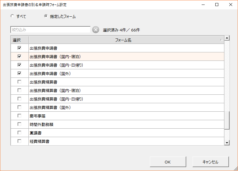 キーワード指定の絞り込み中で、チェックされたフォームが表示されていない場合でも、選択済みフォーム件数 は維持されます。