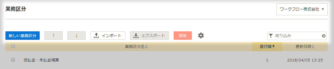 登録済みの業務区分の表示、新しい業務区分の作成、編集などの操作を行います。