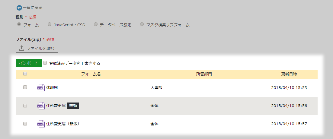 上書きインポートしても、フォームのインポート結果 に以下のメッセージが表示される場合、フォームマネージャーにて登録済みの名称を変更してからインポートしてください。- フォーム名がすでに使用されています。