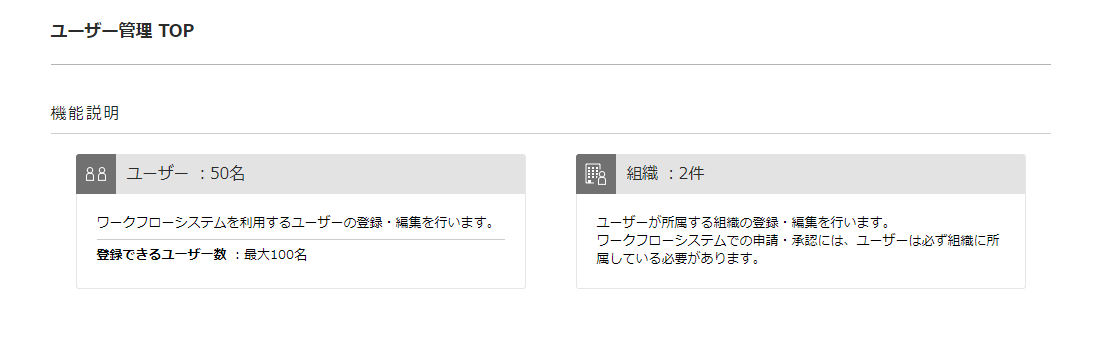 ワークフローシステムで利用するユーザーと組織の管理を行います。