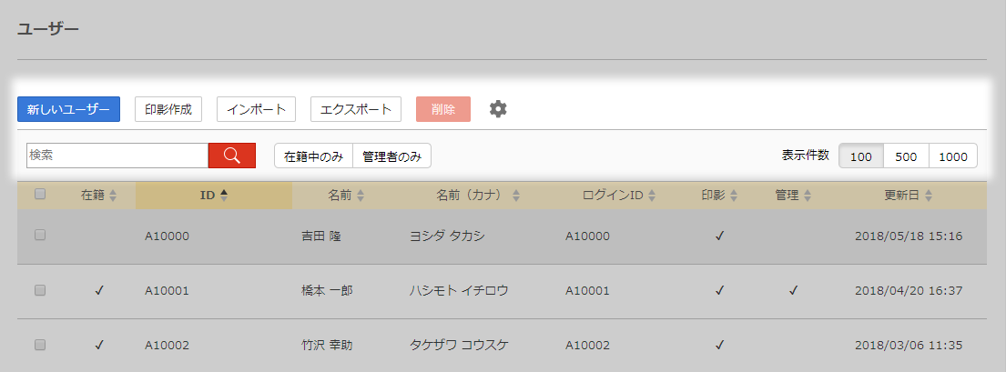 | ID | ユーザーのIDが表示されます。一覧の初期表示はIDの昇順です。 |