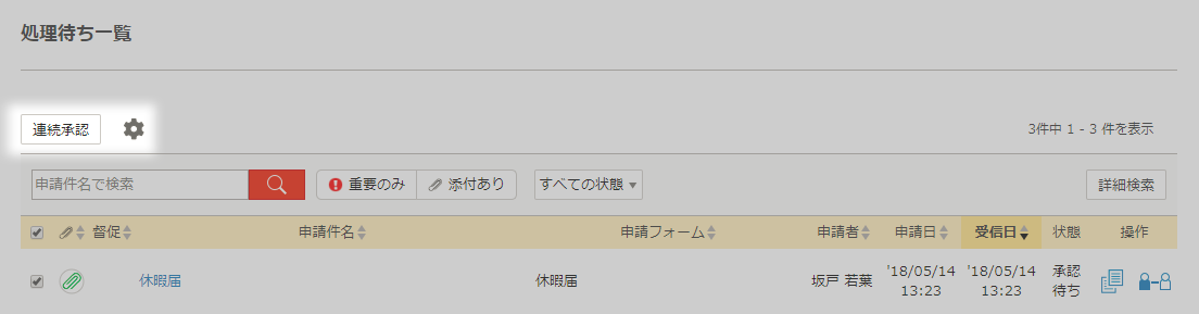 一括承認機能と連続承認機能を両方とも利用不可にすると、[処理待ち一覧]画面の案件毎のチェックボックスが非表示になります。