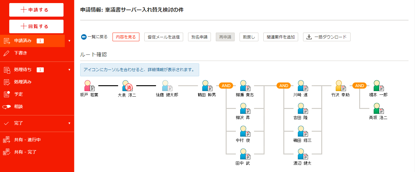 関連案件を設定することで、申請者や承認者は関連付けられた案件の情報を相互に参照できるため、1つの業務で複数の案件内容を確認する場合に便利な機能です。![]()