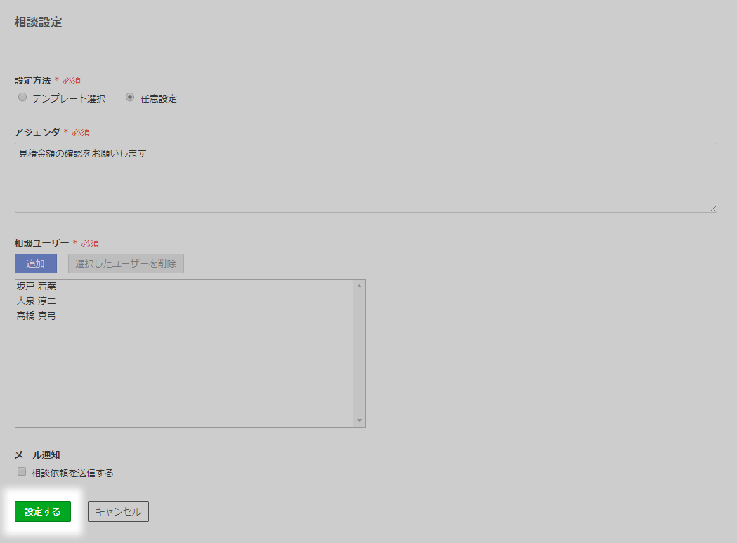 相談テンプレートに登録されたユーザーに対して、相談が開始されたことを通知したい場合は、[相談依頼を送信する]チェックボックスにチェックを入れます。