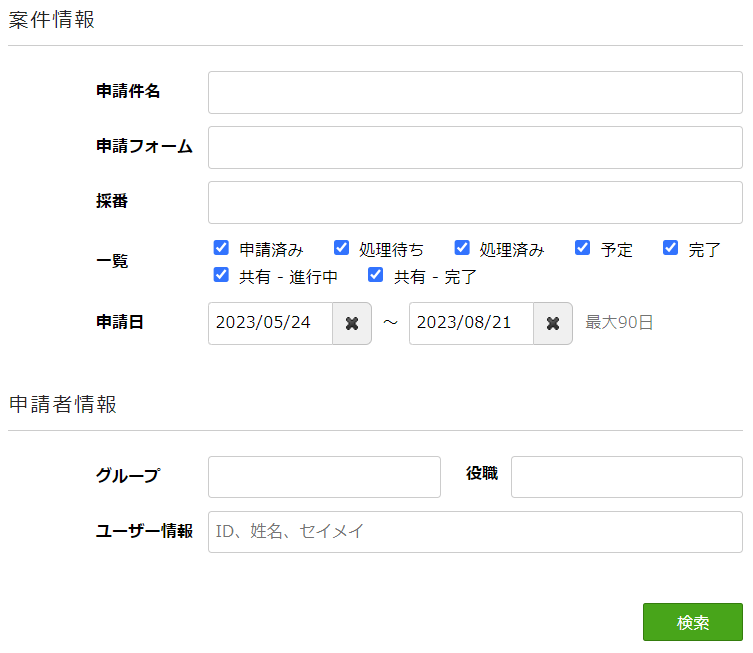 • 申請日は90日の範囲内ならば、過去を遡り検索できます。