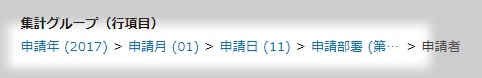 例えば、第1階層に申請年、第2階層に申請月を設定した場合、集計結果の行項目をクリックしてドリルダウンすると、その年を申請月ごとに絞り込んで集計します。