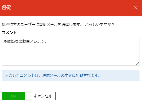 ここに入力したコメントは、督促後に承認者に送られるメールにのみ記載されます。