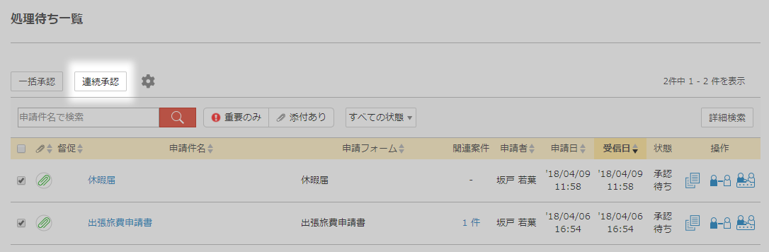 処理待ち一覧画面の見出し上部にある[連続承認]ボタンをクリックすると、別ウィンドウで連続承認画面が表示されます。![]()
