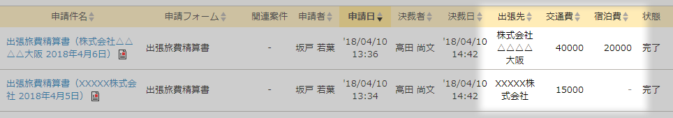 | 決裁者 | 決裁者の氏名が表示されます。 代理承認の場合は全員に[+]アイコンが表示されます。代行承認の場合は代行依頼者、または代行承認者が一覧を表示した場合に[+]アイコンが表示されます。 [+]アイコンをクリックすると代理・代行承認者の氏名を確認できます。 |